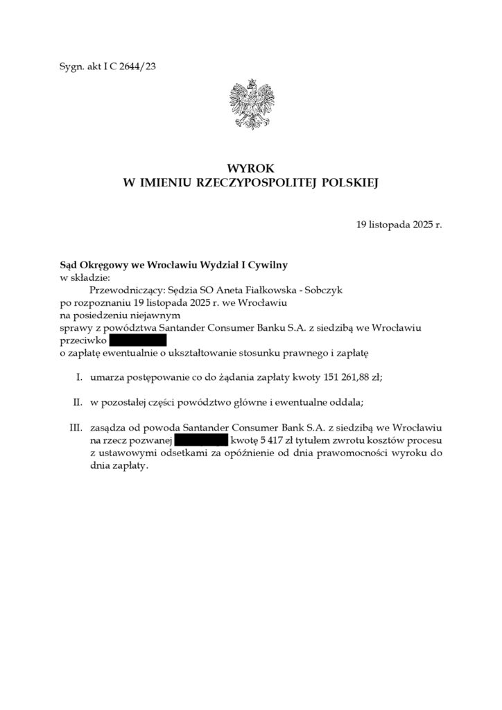 Sąd Okręgowy we Wrocławiu, I Wydział Cywilny wyrokiem z dnia 19 listopada 2025r., sygn. akt IC 2644/23 oddalił pozew Banku o zapłatę przeciwko Klientce Kancelarii z tytułu bezpodstawnego wzbogacenia, ewentualnie roszczenia zwaloryzowanego o wskaźnik inflacji oraz umorzył postępowanie o zwrot kwoty kapitału kredytu oraz zasądził na rzecz Klientki Kancelarii (pozwanej) zwrot kosztów procesu.