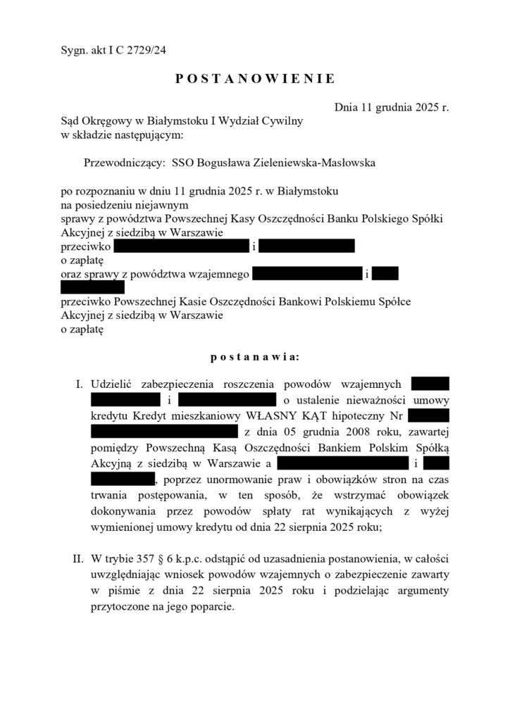 Sąd Okręgowy w Białymstoku postanowieniem z dnia 11 grudnia 2025 r., sygn. akt IC 2729/24 udzielił zabezpieczenia roszczenia Klientów Kancelarii w toku procesu o ustalenie nieważności umowy kredytu poprzez wstrzymanie obowiązku dokonywania spłat rat kredytu na czas procesu.