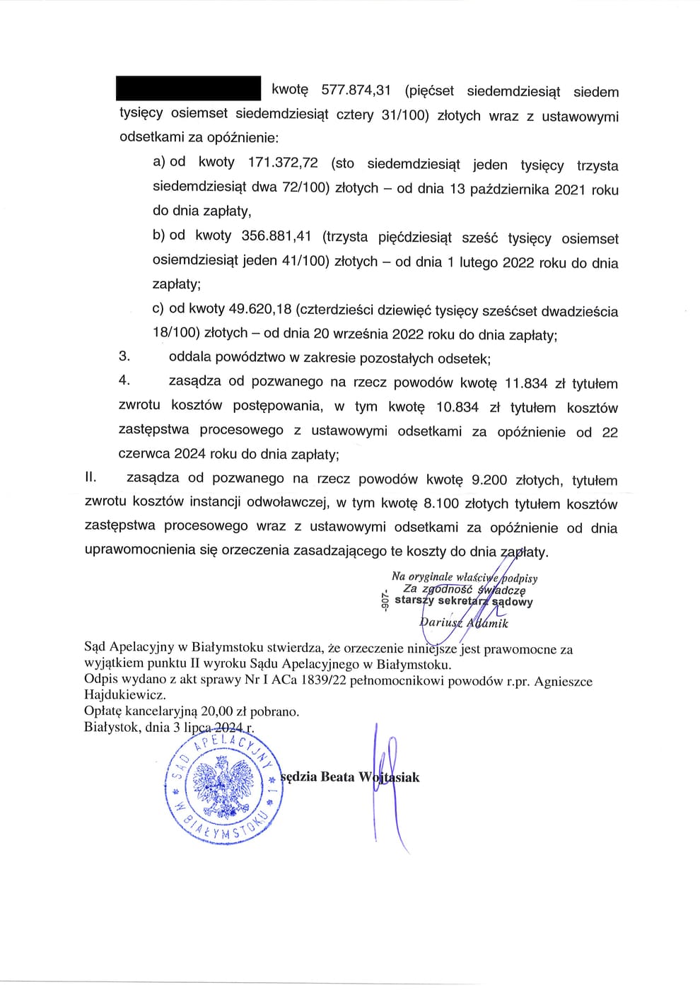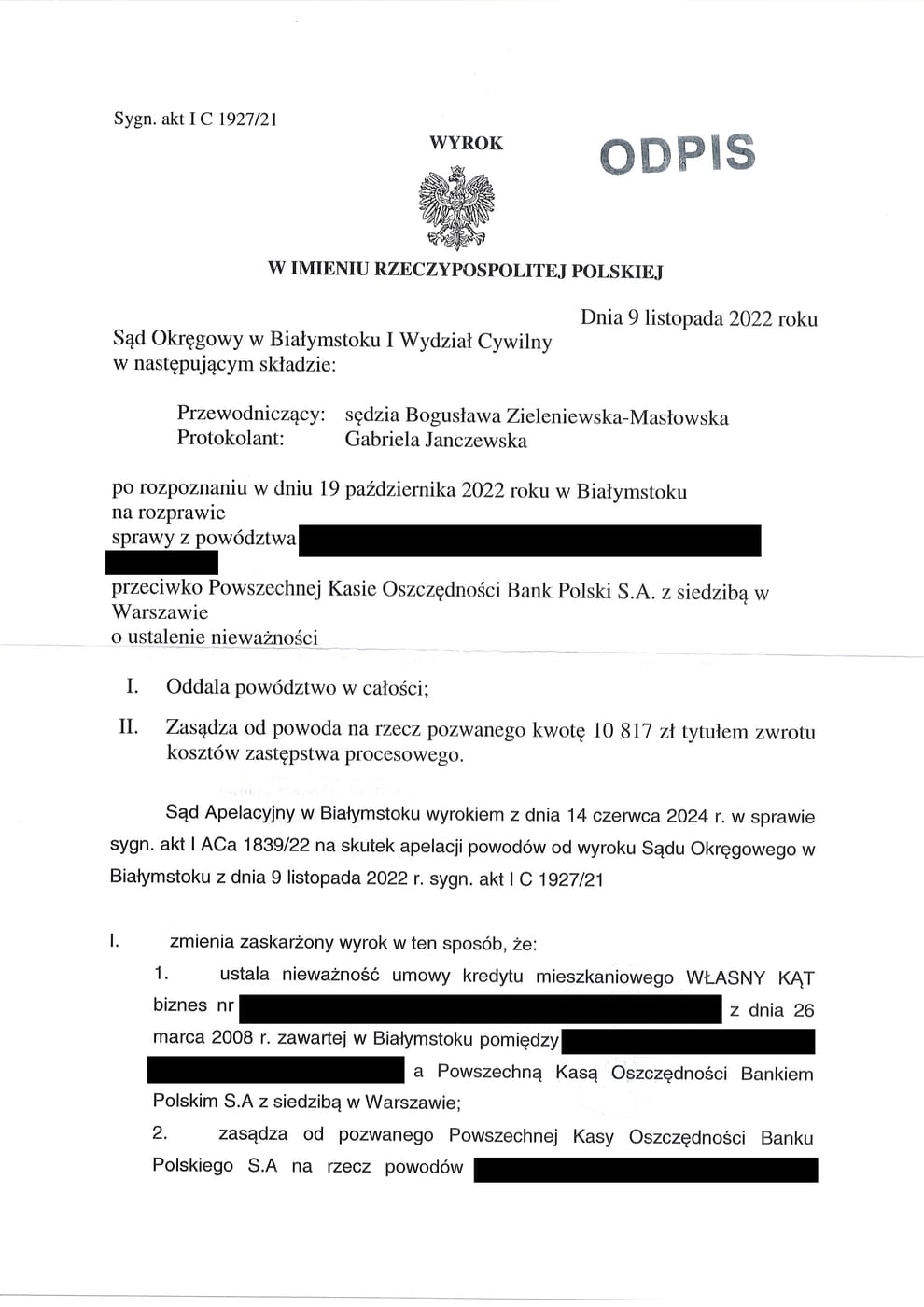 Sąd Apelacyjny w Białymstoku wyrokiem z dnia 14 czerwca 2024 r., sygn. akt I ACa 1839/22 na skutek apelacji Klientów Kancelarii (Powodów) zmienił wyrok Sądu Okręgowego w Białymstoku z dnia 9 listopada 2022 r. sygn. akt IC 1927/21 i ustalił nieważność umowy kredytu mieszkaniowego WŁASNY KĄT BIZNES denominowanego do franka szwajcarskiego oraz zasądził na rzecz Powodów wszystkie kwoty zapłacone przez nich bankowi w wykonaniu nieważnej umowy kredytowej wraz z odsetkami ustawowymi za opóźnienie w części roszczenia od dnia wniesienia pozwu, w części od doręczenia Pozwanemu pozwu i od rozszerzenia powództwa do dnia zapłaty (art. 455 k.c.). Ponadto Klientom Kancelarii zostały zasądzone koszty procesu za obie instancje.